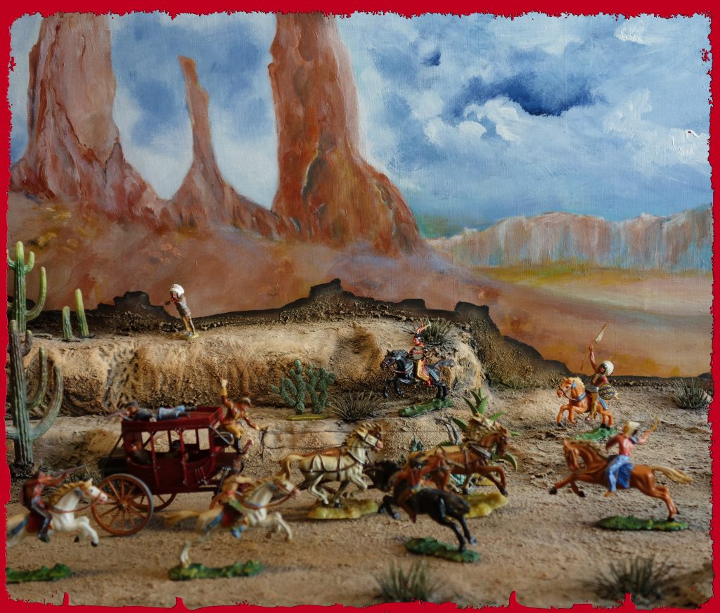 4 cm Elastolin Kutsche – 4cm Indianerreiter – Landschafts Diorama.